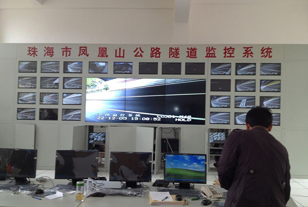 珠海市鳳凰山公路隧道監(jiān)控系統(tǒng)采用彩晨科技46寸高亮2x3液晶拼接屏,旁邊安裝29臺22寸液晶監(jiān)視器