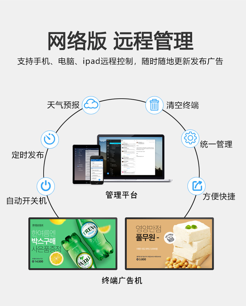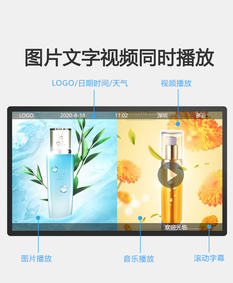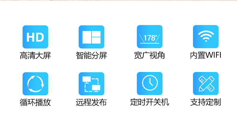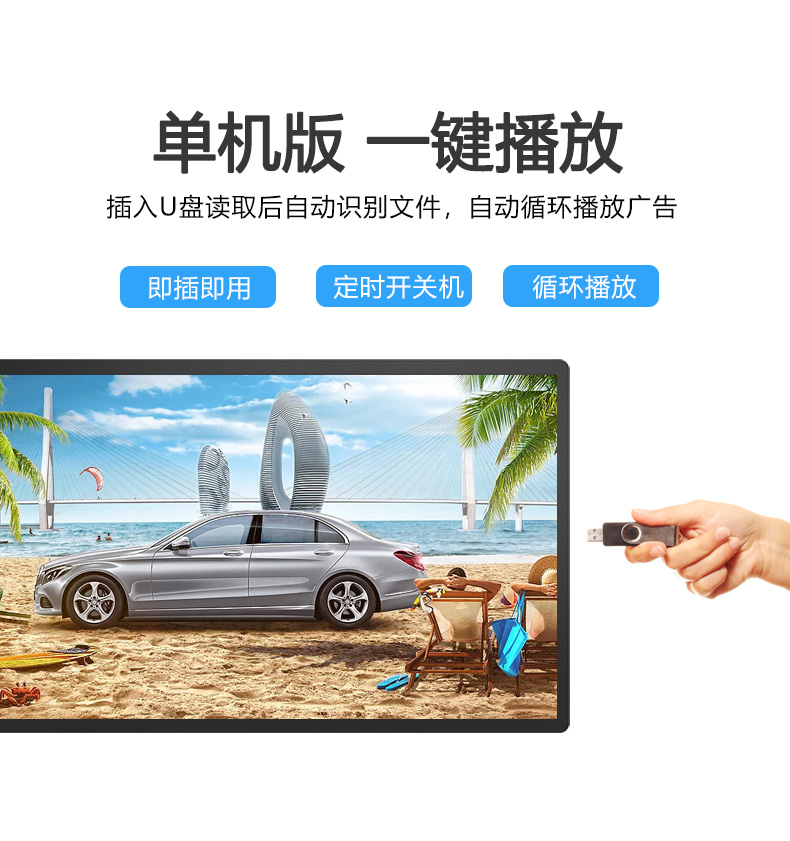 ◆ 通電開機即自動循環(huán)播放,支持定時開/關(guān)機,并可設(shè)定多個自動開、關(guān)機的時間,實現(xiàn)無人管理的模式。