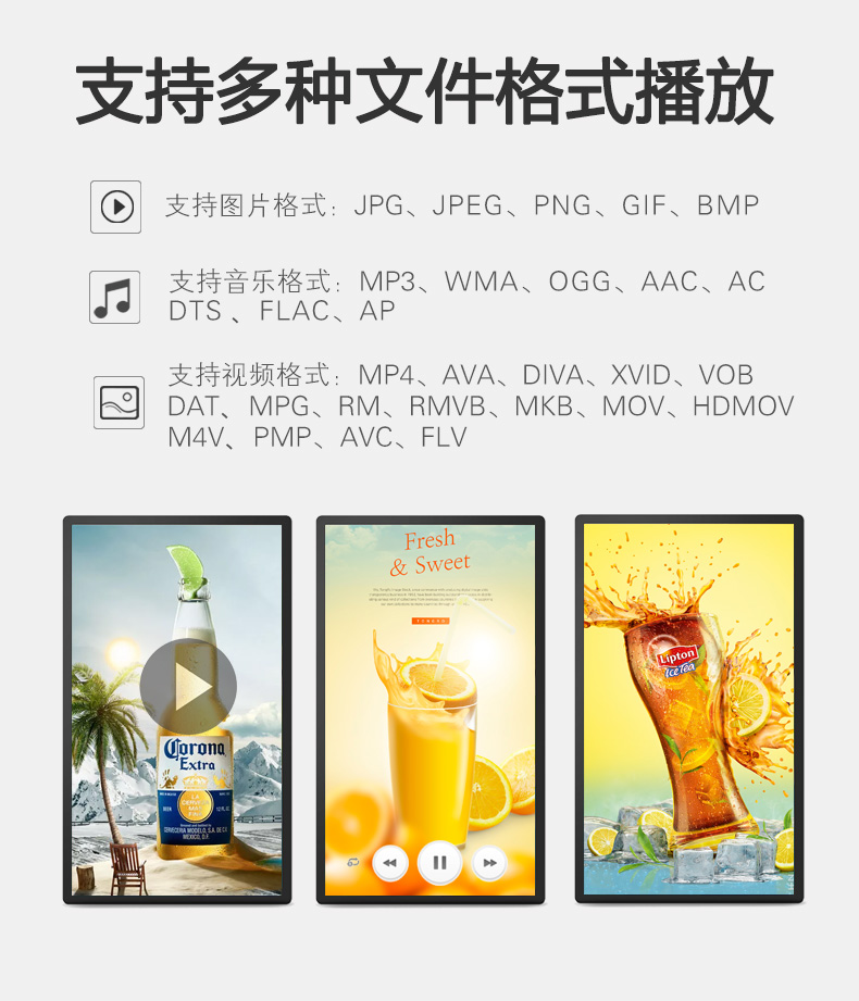 支持幾乎所有的視頻格式(rm、rmvb、avi、mpeg、mpg、dat、mov、asf、mtv、mkv、wmv、3gp、amv、dmv、divx等)音頻(mp3、wma、wav等)圖片(jpg、gif、png等); word/excel文檔、pdf文檔、RSS實時新聞、flash動畫、動態(tài)網(wǎng)頁。