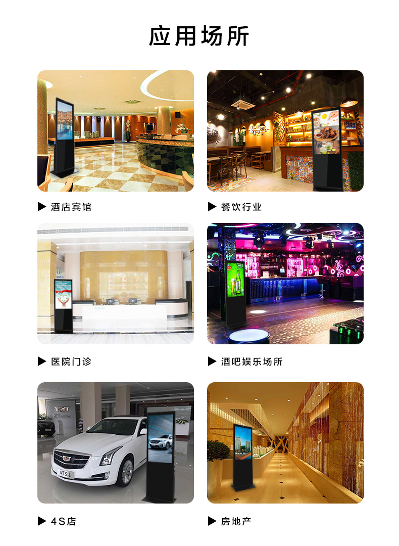 液晶廣告機(jī)應(yīng)用領(lǐng)域: 彩晨科技(CYLSON)液晶廣告機(jī),廣泛應(yīng)用于商場、醫(yī)院、學(xué)校、銀行、酒店、商廈、機(jī)場等場所的廣告宣傳和信息發(fā)布。 1、金融證券----各個(gè)營業(yè)網(wǎng)點(diǎn)放置廣告機(jī),可以發(fā)送各個(gè)網(wǎng)點(diǎn)的特色、信息(圖片、動畫)…… 2、交通運(yùn)輸----機(jī)場、車站、碼頭等熱點(diǎn)地方放置廣告機(jī),可以發(fā)送本地的旅游、住宿等信息; 3、地產(chǎn)物業(yè)----售樓中心、小區(qū)等放置廣告機(jī),可以發(fā)送地產(chǎn)商的樓盤信息、促銷信息、銷售情況等; 4、賓館酒店----各個(gè)大堂或會議室等放置廣告機(jī),可以發(fā)送本店的服務(wù)信息、周邊概況等信息; 5、商住樓宇----寫字樓入口或出口放置廣告機(jī),可以發(fā)送本樓的特色公司和性質(zhì)等; 6、娛樂健身----夜總會、歌廳、娛樂城、健身場所、會所、茶館等,放置廣告機(jī),發(fā)送本地介紹、促銷信息、特色介紹等; 7、商場超市----商場、商廈、超市、連鎖店等,放置廣告機(jī),可以發(fā)送本地的入住商家介紹、推薦產(chǎn)品、折扣信息等; 8、餐飲文化----酒家、飯莊、酒樓、連鎖酒樓等放置廣告機(jī),可以發(fā)送本店特色菜、推薦菜、打折菜服務(wù)特色等; 9、文化場所----劇院、科技館、文化館、圖書館、展覽館、博物館、影院、等放置廣告機(jī),可以發(fā)送本館的情況、介紹等; 10、醫(yī)療衛(wèi)生----醫(yī)院、康復(fù)中心、門診部、特色診療等放置廣告機(jī),可以發(fā)送本地的醫(yī)療情況、辦事指南、專家醫(yī)生等; 11、汽車行業(yè)----4S專賣店、維修站、汽車城、配件銷售等放置廣告機(jī),可以發(fā)送本地的介紹、服務(wù)特色、打折商品等; 12、景點(diǎn)公園----公園、旅游景點(diǎn)、文化古跡等放置廣告機(jī),可以發(fā)送本地的介紹、景點(diǎn)、餐飲服務(wù)等; 13、電子通信----移動、電信、聯(lián)通、網(wǎng)通、鐵通等放置廣告機(jī),可以發(fā)送業(yè)務(wù)辦理,話費(fèi)優(yōu)惠套餐等;